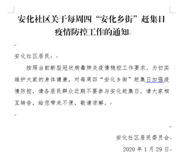 1月29日,安化社區(qū)發(fā)文告誡社區(qū)居民不要參加周四“安化鄉(xiāng)街日”趕集。