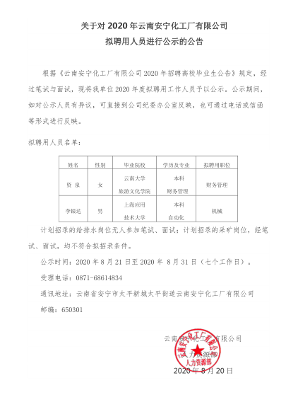 關于對 2020 年云南安寧化工廠有限公司擬聘用人員進行公示的公告