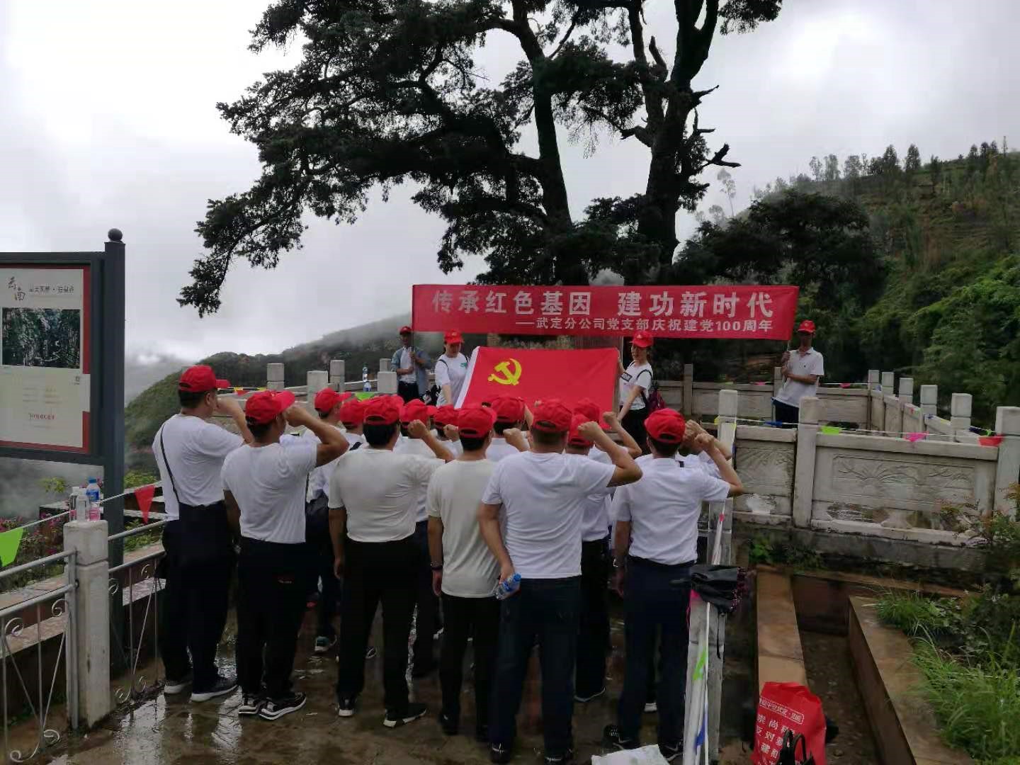 一大早,大家懷著崇敬的心情走進已衣大裂谷“紅軍樹”,追溯紅色記憶,緬懷革命先烈,感受革命情懷。在“紅軍樹”下,面對鮮紅的黨旗,全體黨員整齊列隊,舉起右拳,神情莊重,重溫入黨誓詞,用莊嚴的宣誓聲表達對黨的忠誠和熱愛之情?;顒釉谌w黨員同聲齊唱《沒有共產黨就沒有新中國》的歌聲中圓滿結束。