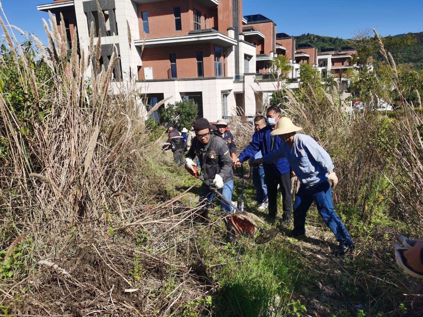 當天大家頂著炎炎烈日,戴著手套,拿著工具對水池周圍一米范圍內(nèi)的灌木、雜草,樹木進行修枝清理和清除消防泵房周圍一米范圍內(nèi)雜草。除草區(qū)域分片區(qū)迅速展開除草行動,有的拿鐮刀割、有的拿鋤頭刨、有的用割草機割、有的拿砍刀砍,還有的直接用手,全然不顧泥草沾滿了褲腿,大家興致高昂、分工合作、積極配合,充分發(fā)揮了不怕苦、不怕臟、不怕累的勞動精神,通過三小時的清理原本雜草叢生的水池便煥然一新,回望路邊一個又一個的草垛,大家都露出了開心的笑容。