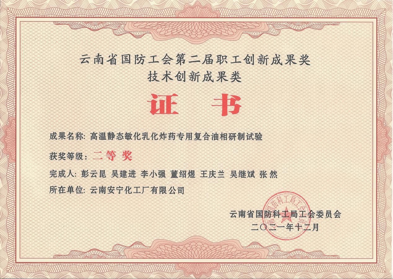 公司開(kāi)展的研發(fā)項(xiàng)目《高溫靜態(tài)敏化乳化炸藥專用復(fù)合油相研制試驗(yàn)》在經(jīng)過(guò)申報(bào)考核后獲得云南省國(guó)防工會(huì)第二屆職工創(chuàng)新成果獎(jiǎng)技術(shù)創(chuàng)新成果類二等獎(jiǎng)。